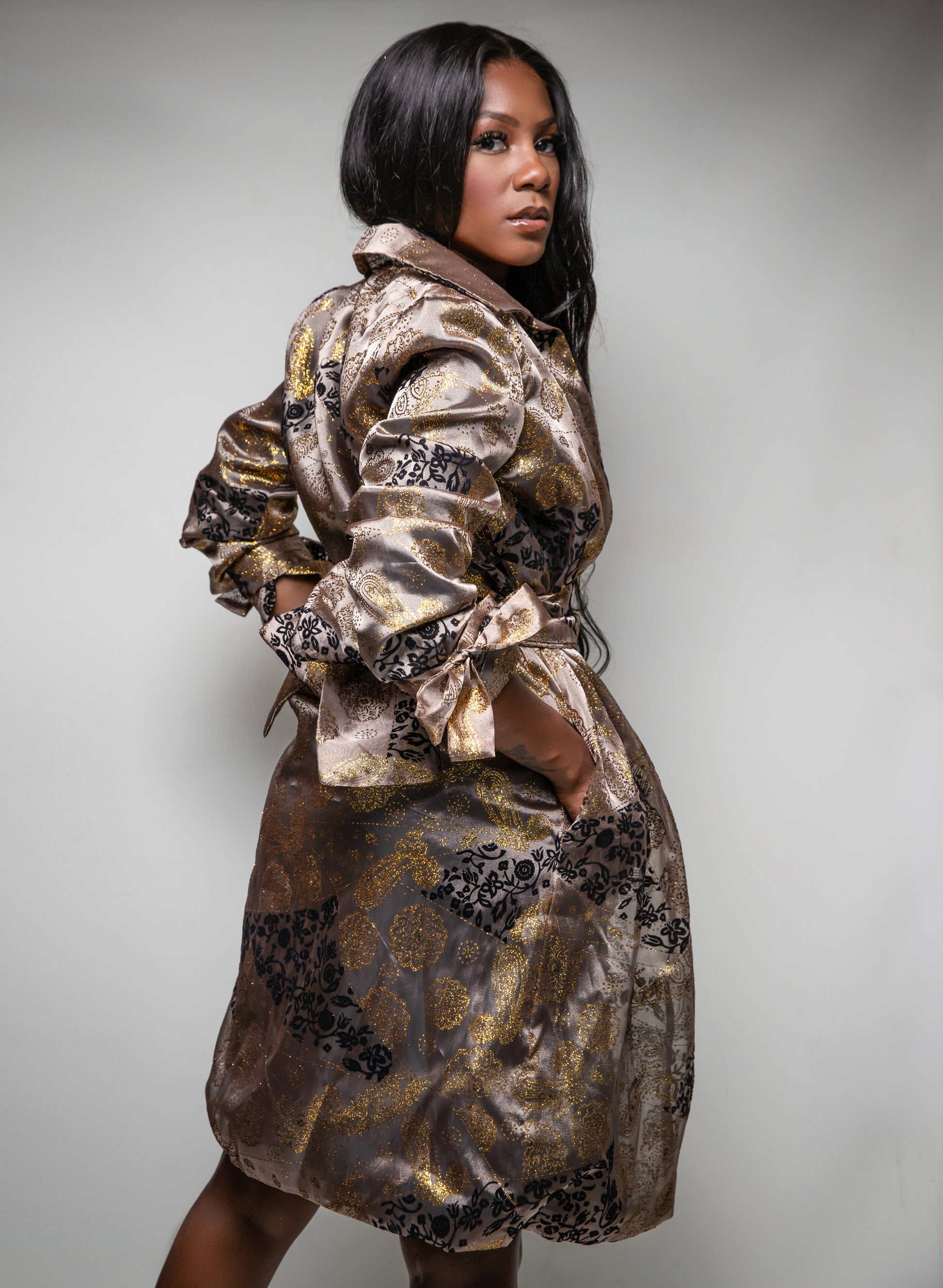 Step into your spotlight in The Power Play Set — a statement-making 3-piece ensemble designed for the fearless woman who owns every room. Featuring a custom jacquard trench coat with gold foil detailing, a matching high-waist mini skirt, and a bold lace harness bralette, this look balances power and sensuality in perfect measure.