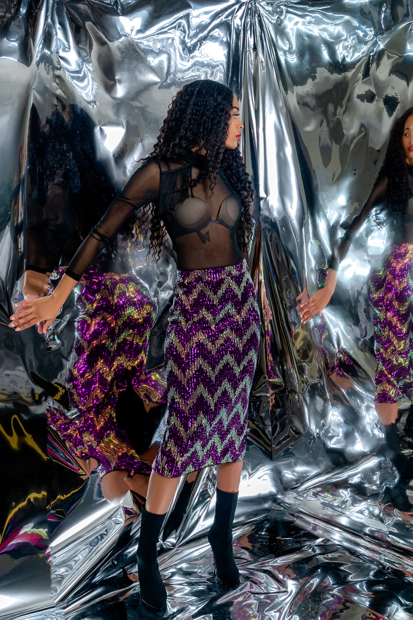 Introducing the PROGRAM PENCIL SKIRT - designed for the stylish and confident fashionista. This unique piece boasts a digital zigzag sequin pattern, a side zipper for the perfect fit, and amazing stretch for all-day comfort. The sophisticated knee-length cut and iridescent glow make it a versatile and eye-catching addition to any wardrobe. Get ready to turn heads and make a statement in this one-of-a-kind skirt!