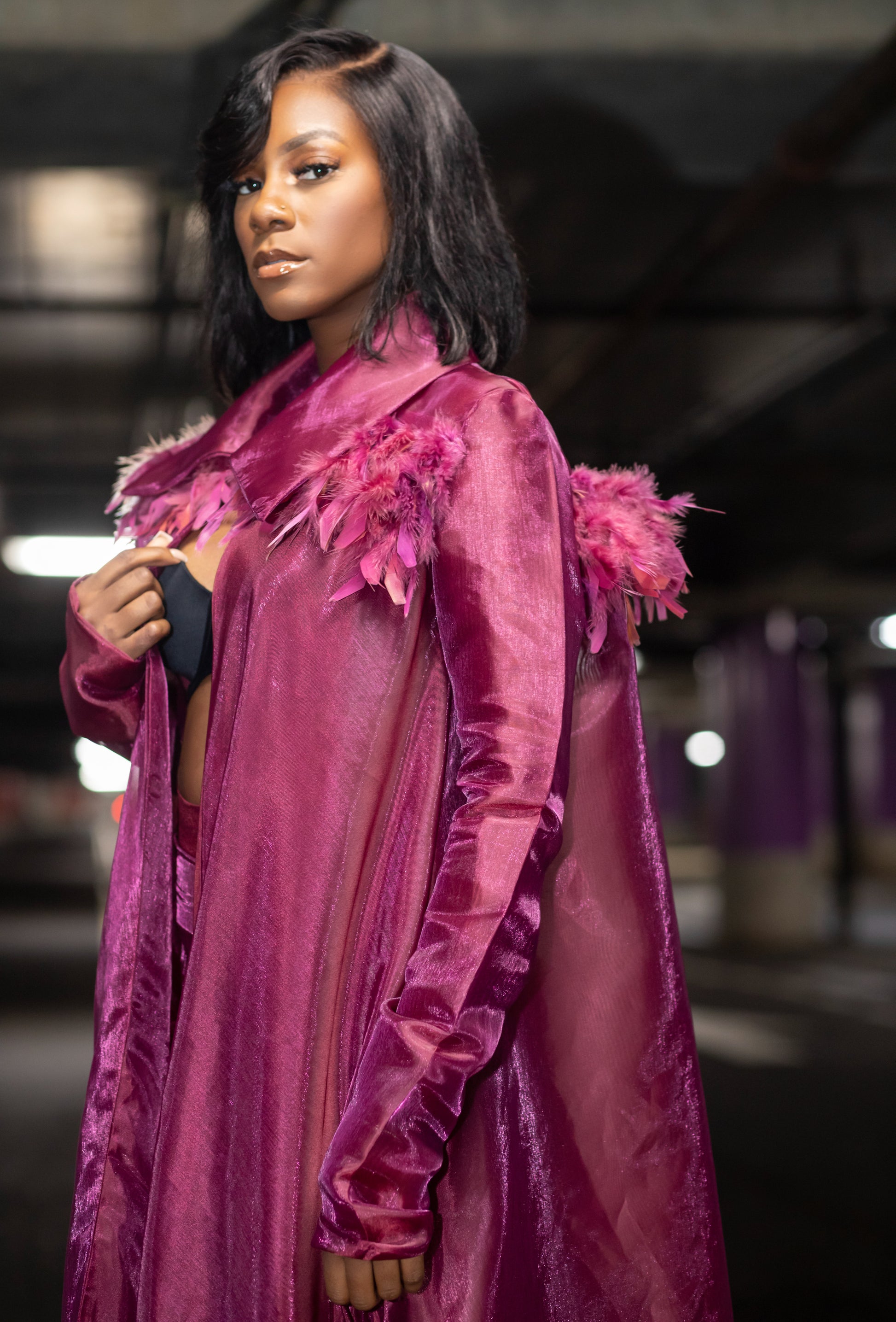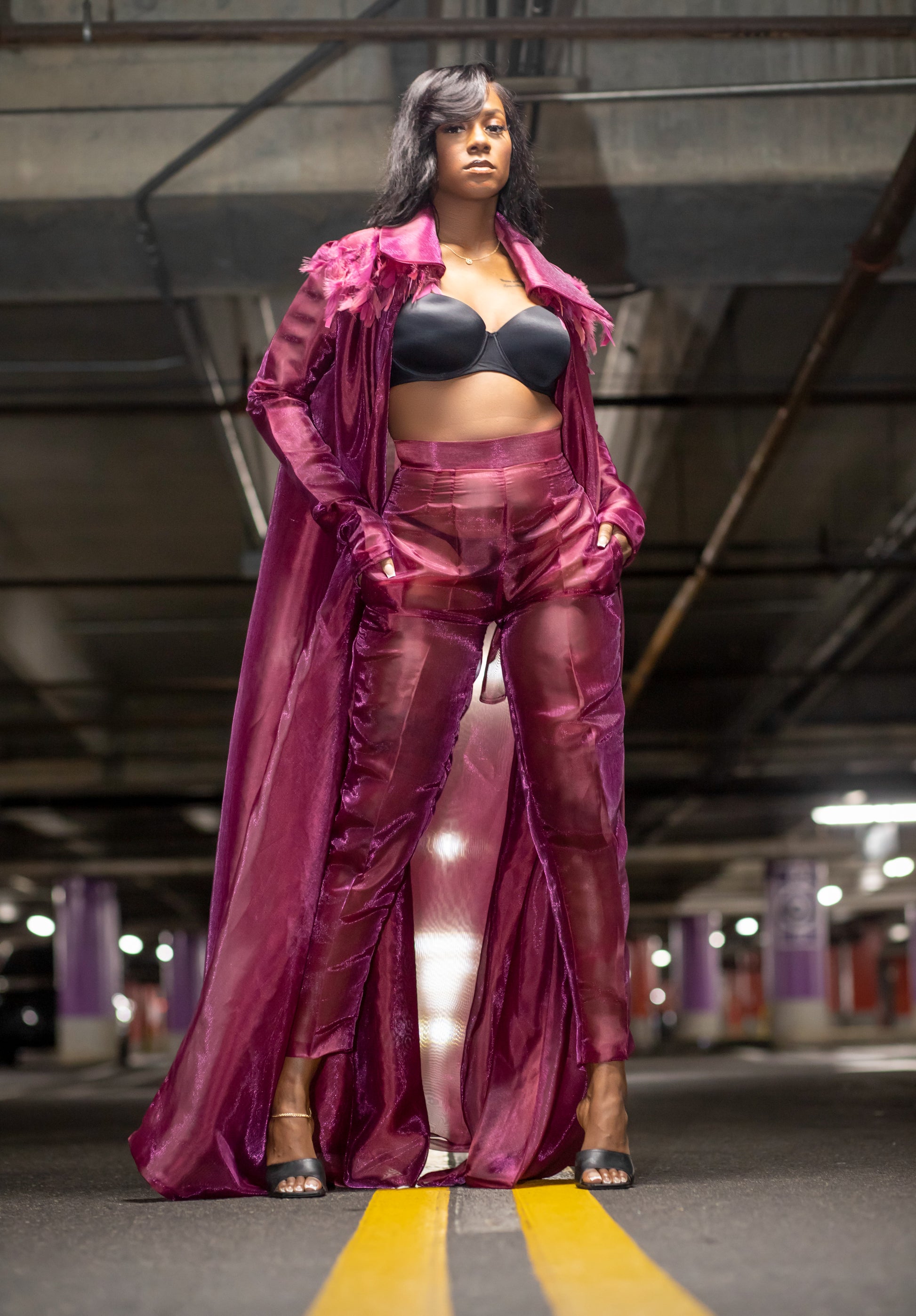 The elegant burgundy trench coat features delicate silk feathers on the back shoulder blades and bust line, creating a regal and feminine touch. With its princess dress-like draping and double layer design, this coat is both stylish and functional, boasting in-seam pockets and a high, wide collar. To complete the ensemble, there's a coordinating slim fit pant with darts for a perfectly tailored look and in-seam pockets, as well as a wide waistband for a flawless fit.