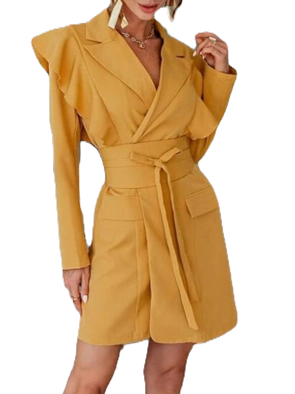 Elegant mustard yellow blazer dress. Blazer is drawn to the center of the silhouette with a single button fastening. Detailed with exaggerated ruffled shoulders, finished with matching obi waist belt. A vibrant spring must have, a piece sure to fit any day out occasion.